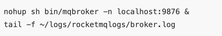 同样也要确保你的机器中已经安装了与 RocketMQ 相匹配的 JDK ,并设置了环境变量 JAVA_HOME ,然后在 RocketMQ 的安装目录下执行 bin 目录下的 mqbroker ,默认会将该命令的执行情况输出到当前目录的 nohup.out 文件,最后跟踪日志文件查看 Broker 的实际运行情况。