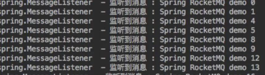 假如启动两个 SpringConsumerTest 类进程,因为它们属于同一消费者组,在 SpringConsumerTest 的控制台能看到它们均摊到了消息: