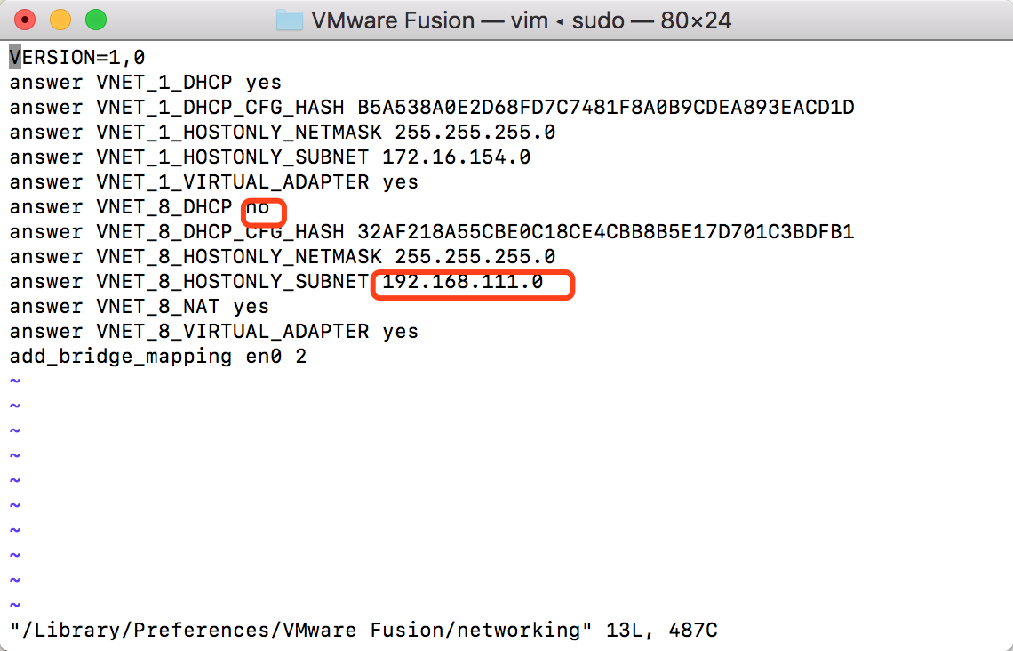 sudo vi /Library/Preferences/VMware\ Fusion/networking