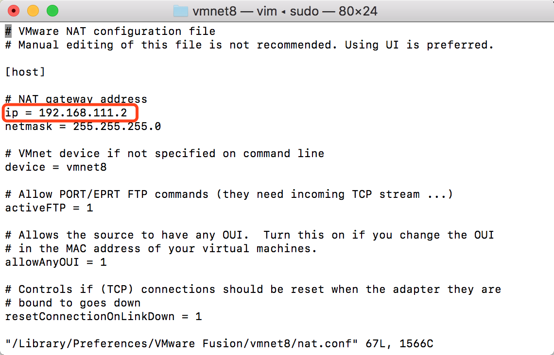 1.2 修改 /Library/Preferences/VMware\ Fusion/vmnet8/nat.conf 。