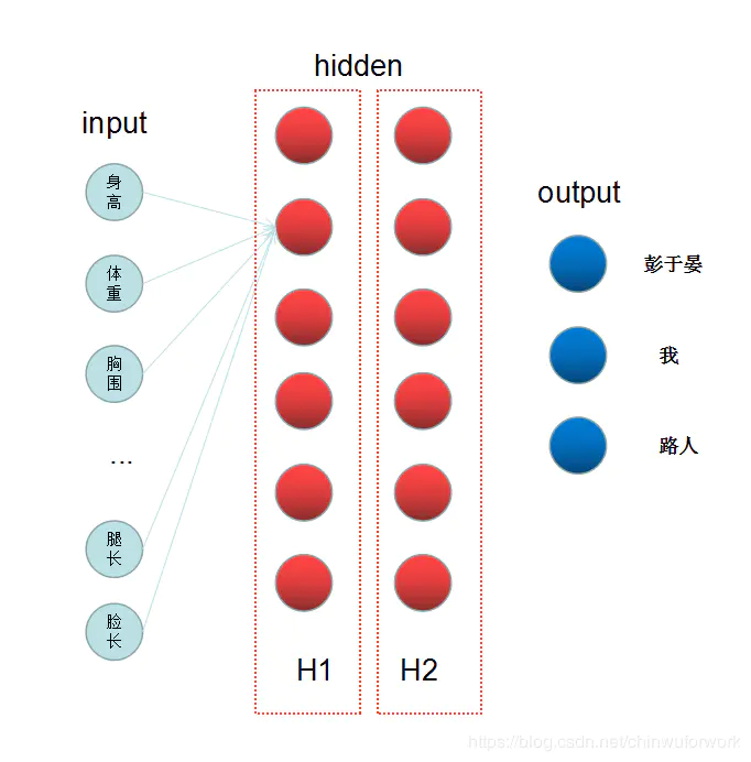 我们的输入特征是:身高、体重、胸围、腿长、脸长等等一些外貌特征,输出是三个类:帅气如彭于晏,帅气如我,路人。