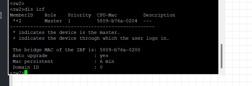 步骤 1:修改 SW2 的 IRF 设备 ID 为 2,保存配置,并重启生效