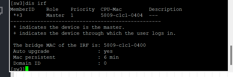 This command will reboot the device. Continue? [Y/N]:y步骤 2:SW3 和 SW4 修改 IRF 设备 ID 方法与 SW2 一致,重启后,通过命令