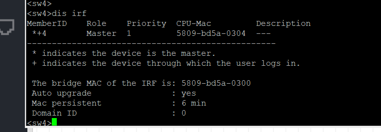 This command will reboot the device. Continue? [Y/N]:y[sw4]irf me 1 re 4