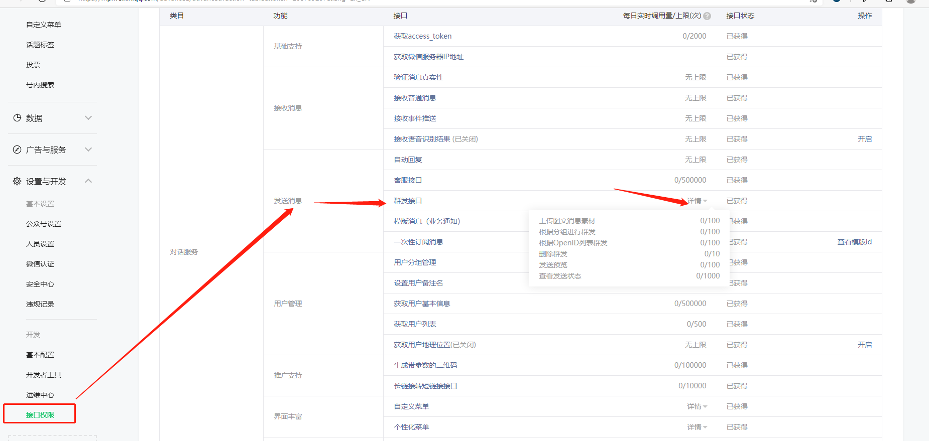 4.登录以后可以在接口权限查看 是否有群发权限 因为我用的公司服务号 所以权限都是有的