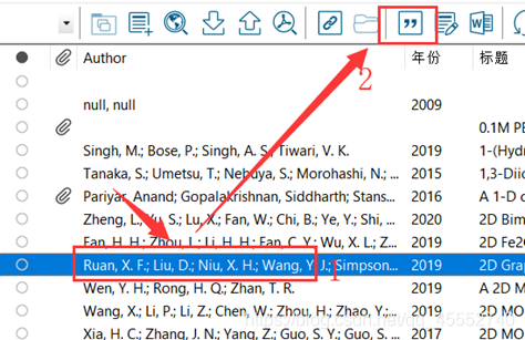在word中插入一篇引文;打开EndnoteX9.1软件,选中一条参考文献(单击选中后文献显示为蓝色),然后按住键盘快捷键 Alt+2 或者点击软件工具栏如下这个引号图标
