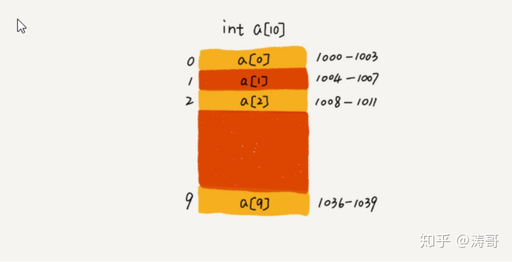 第二个是连续的内存空间和相同类型的数据。正是因为这两个限制,它才有了一个堪称“杀手锏”的特性:“随机访问”。但有利就有弊,这两个限制也让数组的很多操作变得非常低效,比如要想在数组中删除、插入一个数据,为了保证连续性,就需要做大量的数据搬移工作。说到数据的访问,那你知道数组是如何实现根据下标随机访问数组元素的吗?我们拿一个长度为 10 的 int 类型的数组 int[] a = new int[10]来举例。在我画的这个图中,计算机给数组 a[10],分配了一块连续内存空间 1000~1039,其中,内存块的首地址为 base_address = 1000。