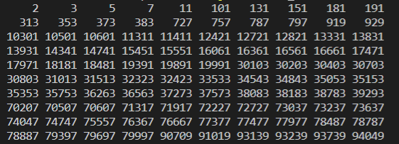输出100个回文素数。回文数是指数字反过来与原数字相同,素数是值一个整数只能被1和它本身整除。每打印十个数字,换行。