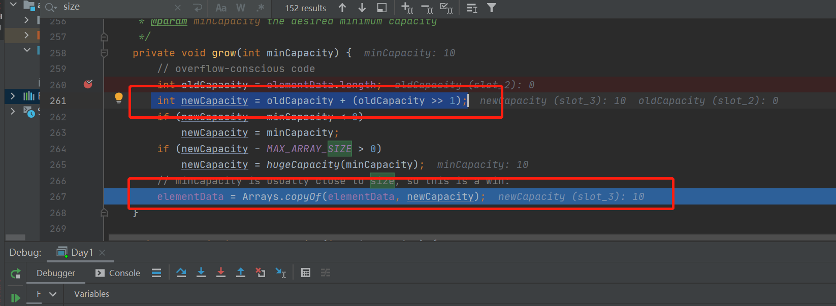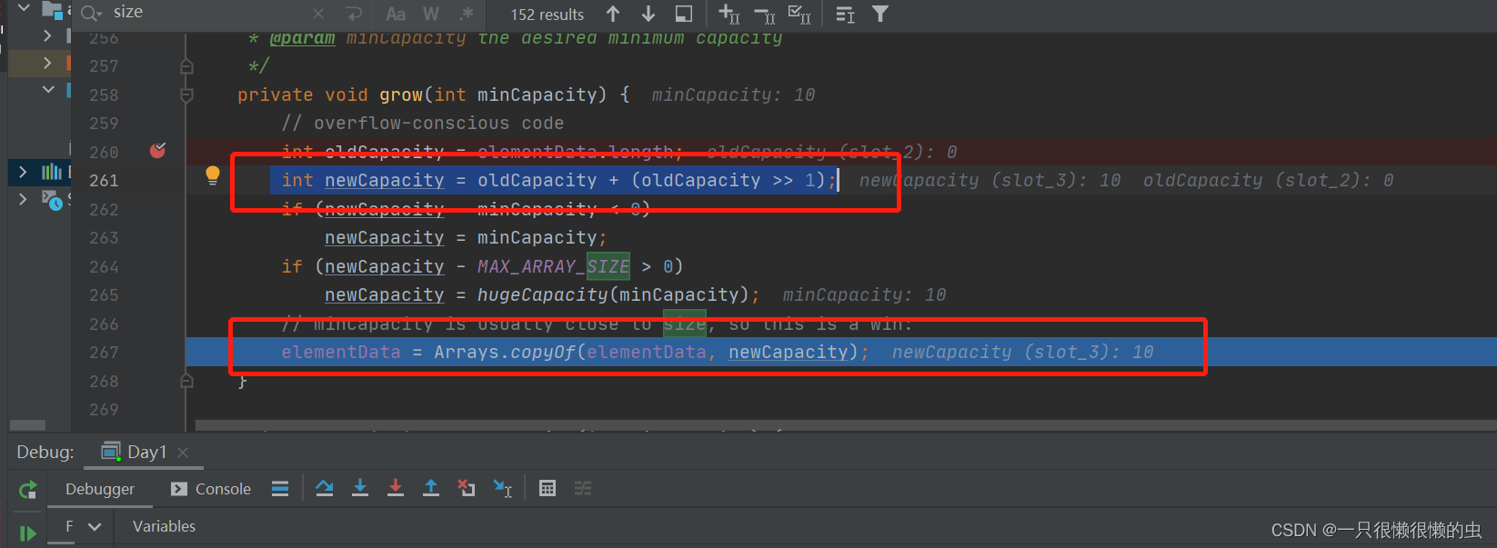 2.1 先对初始化的数组进行扩容。如果是首次添加数据,则默认初始化为 10;此时会调用一次扩容算法。新的数组长度会是原长度的1.5倍;确定好数组需要扩容的大小后,开始复制数组到新数组中;