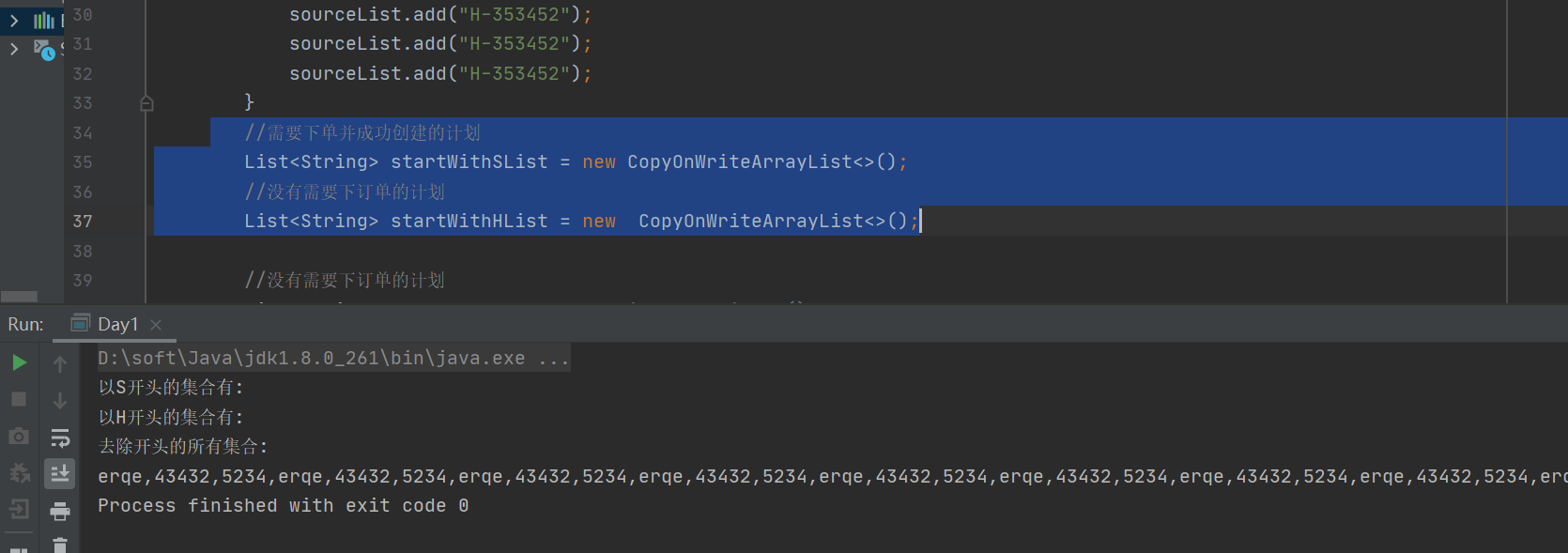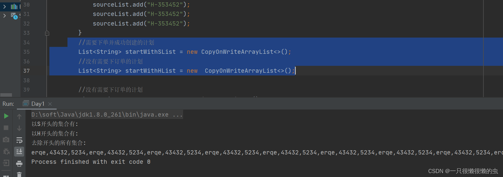 }运行结果一:在多线程中使用 ArrayList 来分别收集以S,和H 开头的 字符串。 看打印的结果发现出现 null ;