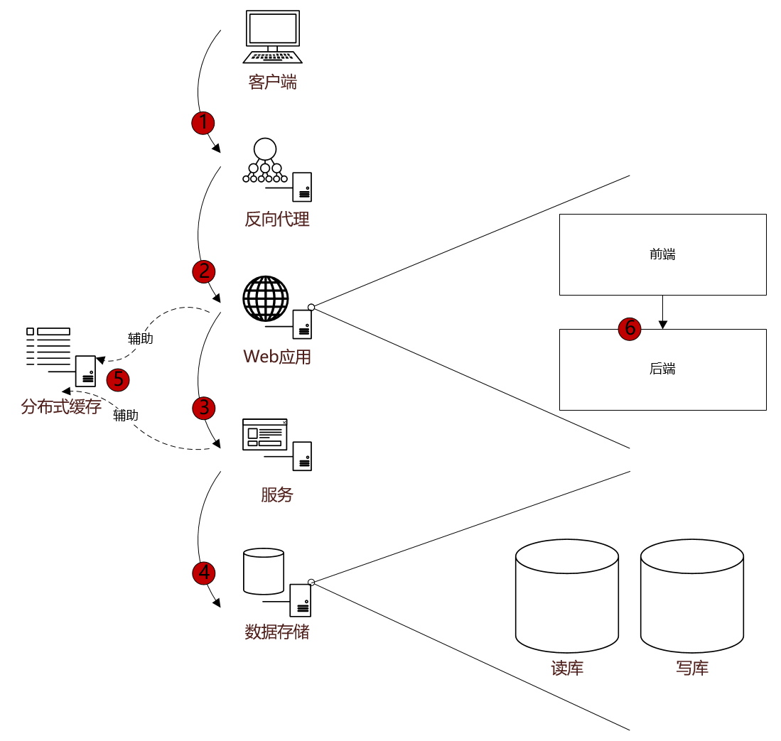 分布式系统有各式各样的架构方式,不过本质上都是上图这样的一个分层架构。图中红点标记出的地方就是我们需要做「负载均衡」的地方,可以看到,就是每两层之间的连接处。