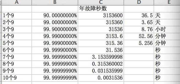 SLA完整的定义会复杂的多,在软件系统中主要是取了其中的「有效工作时间」部分。只要系统一直能够提供服务,我们就可以说系统的可用性是100%,但这只停留在理想中。如果系统每运行100个时间单位,会有1个时间单位无法提供服务,我们说系统的可用性是99%。贴一张常见的表格图: