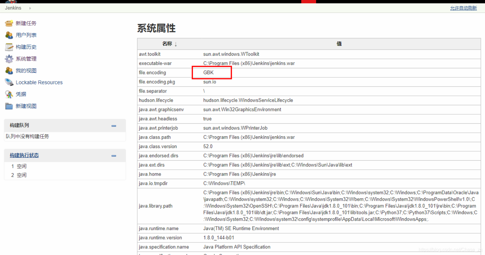 查看Jenkins系统属性果真修改成功了。但是新问题又来了,我重新构建了下我的项目发现仍然报错,而且还出现了中文乱码。
