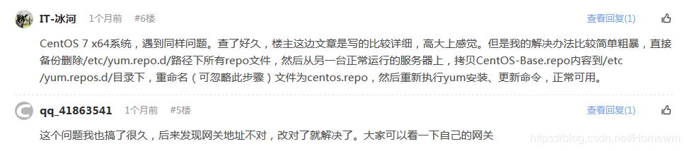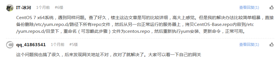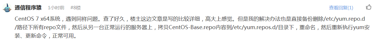 CentOS 7 x64系统,遇到同样问题。查了好久,楼主这边文章是写的比较详细,高大上感觉。但是我的解决办法比较简单粗暴,直接备份删除/etc/yum.repo.d/路径下所有repo文件,然后从另一台正常运行的服务器上,拷贝CentOS-Base.repo内容到/etc/yum.repos.d/目录下,重命名(可忽略此步骤)文件为centos.repo,然后重新执行yum安装、更新命令,正常可用。