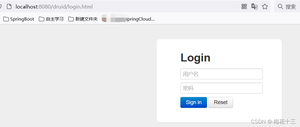 2. 配置完毕后重启项目,我们可以访问 :http://localhost:8080/druid ,会默认进入到监控登录页