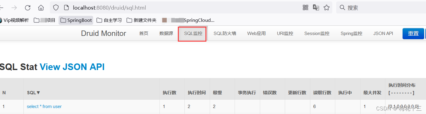 再切换到druid的监控页,进入SQL监控tab栏目中,查看刚刚执行的sql语句信息