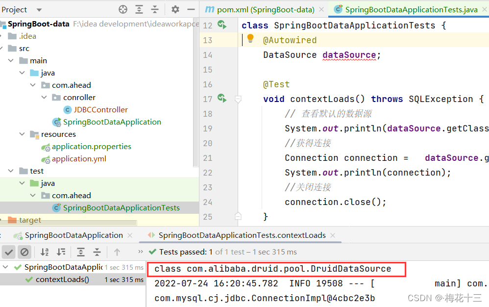 type: com.alibaba.druid.pool.DruidDataSource # 自定义数据源3、数据源切换之后,在测试类中注入 DataSource,然后获取到它,输出一看便知是否成功切换;