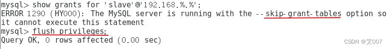 - 分析:--skip-grant-tables 为免密登录执行语句,报错原因可能在授权数据库的时候添加了密码,但 MySQL 还在运行免密登录模式,前后登录条件不一致导致无法执行。