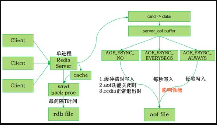 aof模式缺点:由于所有命令都写入aof文件,aof相对较大,所以redis也提供了aof文件重写机制来给aof瘦身;另外aof的写入模式选择也会对redis的性能产生影响(见图右)。