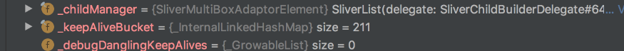 可以看到这里面是否会做缓存主要是由一个keepAlive的标志决定的。对于sliverList默认情况下所有的child是不开启keepAlive的,也就是说每次布局只要是被认为不需要的child都会被销毁。而如果我们需要让某个child变为keepAlive状态,只需要在这个child的widget外面用“AutomaticKeepAliveClientMixin”包装一下,就可以实现对它做缓存。图22所示是把每个child都设置成keepAlive的状态后的缓存截图,可以看到keepAliveBucker这个Map里面缓存了每个index对应的child,数量达到了200多个child。