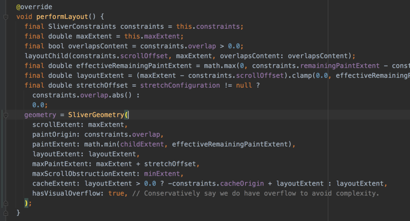 其对应的renderObject是RenderSliverPinnedPersistentHeader,它的布局代码如图12所示。重点关注一下其返回给renderViewPort的SliverGeometry中的paintOrigin,这个参数直接给的就是“constraints.overlap”。那么这个参数在renderViewport中具体代表什么意思哪。