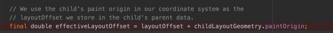 再回头来看renderViewport的layoutChildSequence方法。前面说了这个方法会遍历自己所有的子sliver然后逐个布局,在这个过程中我们着重关注一下maxPaintOffset和layoutOffset这两个变量。在普通场景下这两个值都是从0开始,随着对child list的遍历而做相应的递增,也就是说默认的情况下这两个offset都是相等的。但是参考图13所示,黄色部分的某个pinned sliver child模块如果前面已经出现了红色区域的吸顶部分,那么此时对于黄色的这个child这两个值的位置就不是一致的了。如图中所示,可以看到此时对于它的PaintOffset是比layoutOffset大的,而它们之间的差值就是作为输入传给黄色sliver的overlap。可以看到RenderSliverPinnedPersistentHeader在自己的布局方法中,在返回给renderViewPort的“SliverGeometry”返回值中的paintOrigin就是直接赋的这个值。