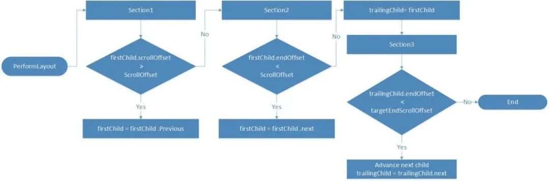 第二个阶段是一个相反的过程,它会从第一个阶段找到的那个child往后找,找到第一个child的尾部是超过scrollView的当前的scrollOffset。那么这个child就是接下来用户在当前所能看到的第一个child了,本次的布局也只需从这个child开始,index在这个child之前的children相应肯定是看不到的,因此本次布局和渲染会忽略它们。在这之后会定义一个游标trailingChild指向child。