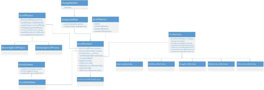 1)首先可以看到” scrollPosition”是继承于ViewportOffset和ScrollMetrics这两个类。其中ScrollMetrics主要描述了scroll基本的一些状态信息。比如当前Srollable可视区域的大小,最小、最大的滑动offset限制,以及当前的offset。而ViewportOffset则提供了很多改变offset的方式,比如不带任何过渡交互效果就直接滑动到某个offset的“jumpto”方法,还有可以以带动画的方式滑动到某个offset的“animateto”。同时可以看到ViewportOffset的父类是一个ChangeNotifier,也就是说” scrollPosition”改变是可以被观察的。因此可想而知Srollable的子child也就是真正我们要显示的内容ViewPort会以观察者的模式监听它的改变,从而做出相应的变化。