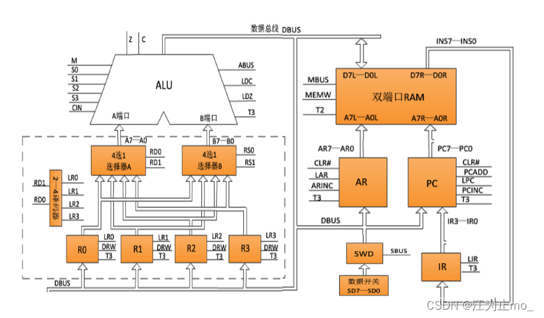 1-逻辑运算 0-算术运算 | 算术加/减 逻辑与/或 | 选择送往A端口的寄存器 | 选择送往B端口的寄存器 | 低进位输入 | 开关数据送往DBUS | 保存C标志 | 保存Z标志 | 在T3上升沿写入RD1-RD0指定寄存器 | ALU运算结果送往DBUS | 数据总线DBUS上的数据 | ALU A端口数据 | ALU B端口数据 |