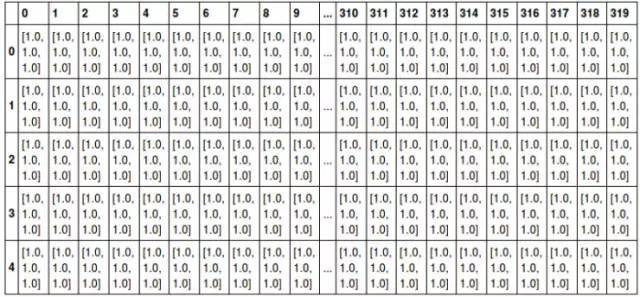 其中表的横轴表示图片的宽度值,这里只截取0~319;表的纵轴表示图片的高度值,这里只截取0~4;表格中每个方格代表一个像素点,比如第一行第一列的表格数据为[1.0,1.0,1.0],代表的就是RGB三原色在图片的这个位置的取值情况(即R=1.0,G=1.0,B=1.0)。