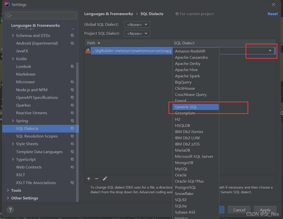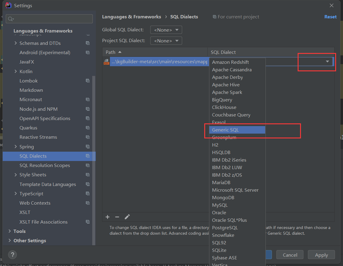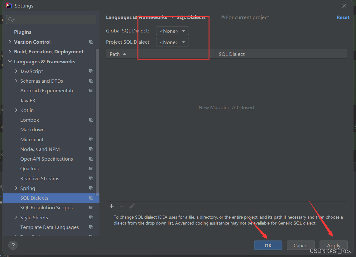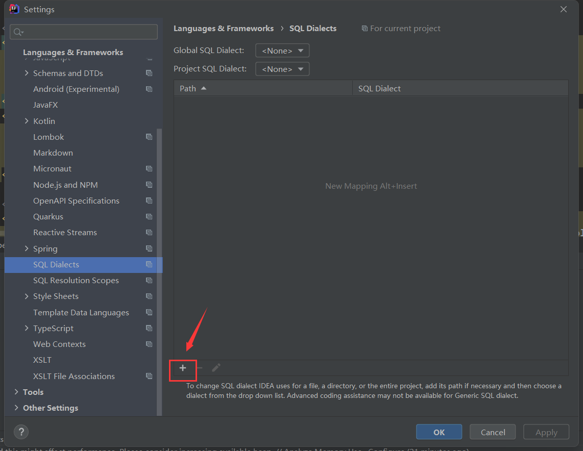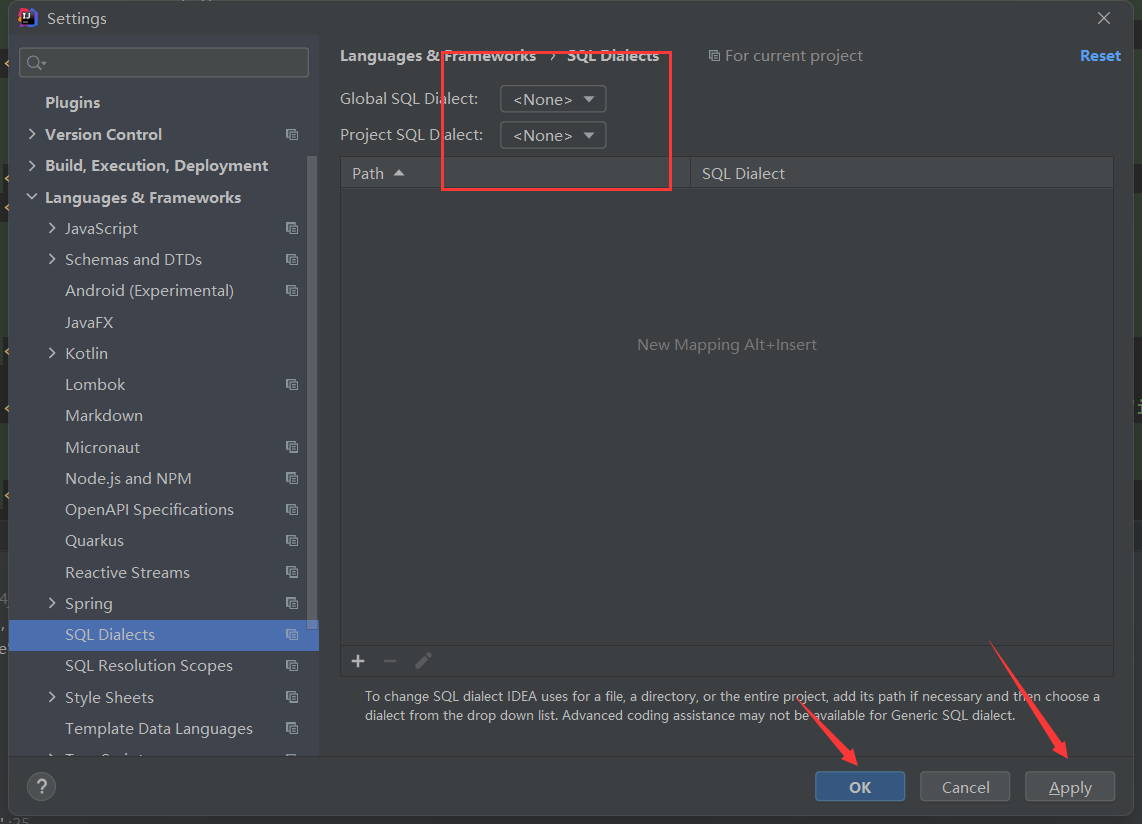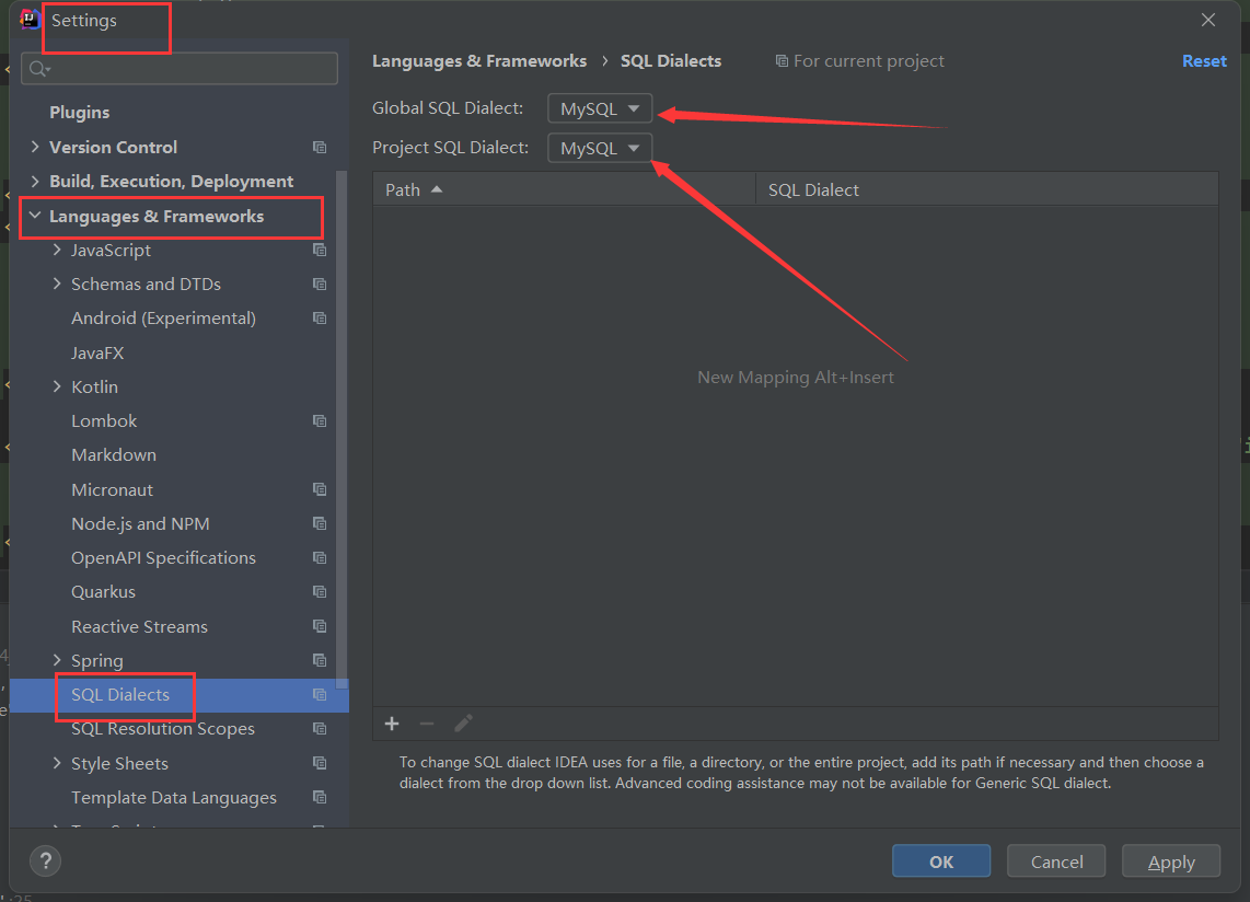 打开File ==> Setting ==> Languages & Frameworks ==> SQL Dialects