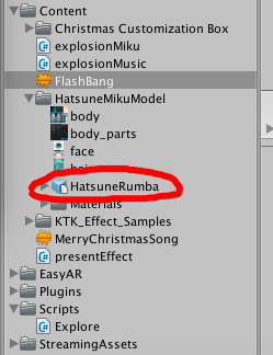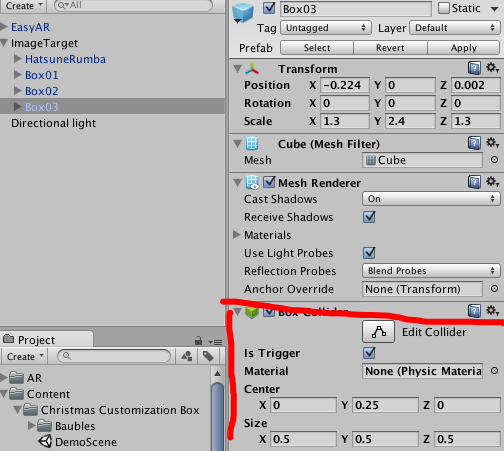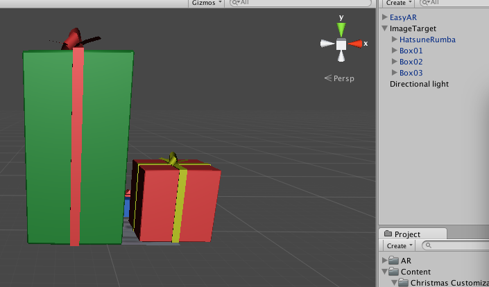 我们将准备好的资源--礼物与二次元女生导入到unity中,并将三个礼物盒子与女主角拖入到ImageTarget 充当子物体,礼物盒的模型位置在