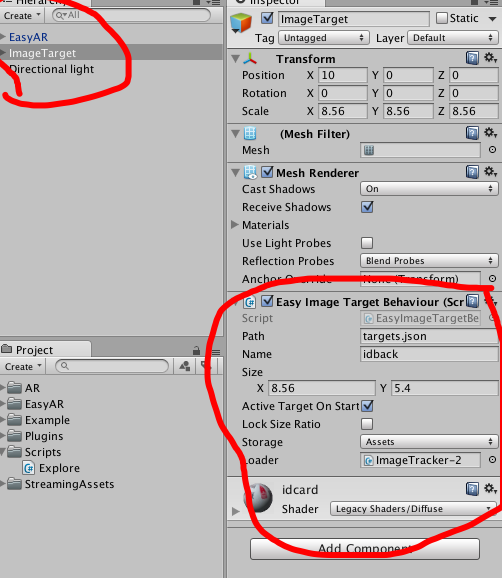 我们下好资源后,导入到unity,搭建好基本AR环境。如图: