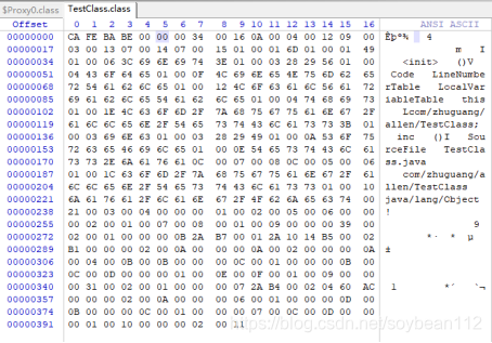 我们编译该代码后,用winhex打开编译后的Class文件,如下图所示: