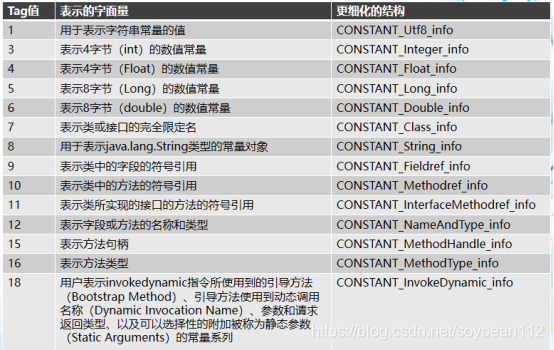 常量池总的每一项常量都是一个表,JDK7之后共有14种结构各不相同的表结构数据,如下图所示: