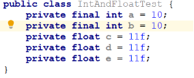 我们来建一个测试类,声明了五个变量,但是取值就两种int类型的10 和Float类型的11f。如下图所示: