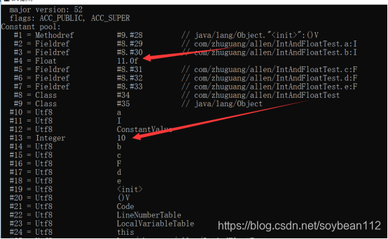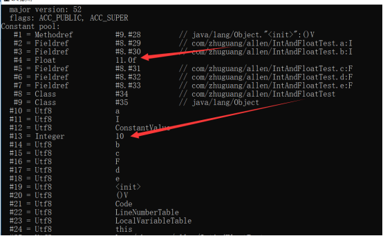 从结果上可以看到常量池第#13 个常量池项(cp_info) 就CONSTANT_Integer_info,值为10;第#4个常量池项(cp_info) 就是CONSTANT_Float_info,值为11f。