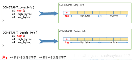 Java语言规范规定了 long 类型和 double类型的数据类型占用8 个字节的空间。那么存在于class 字节码文件中的该类型的常量是如何存储的呢?相应地,在常量池中,将long和double类型的常量分别使用CONSTANT_Long_info和Constant_Double_info表示,他们的结构如下所示: