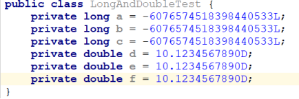 新建一个测试类 LongAndDoubleTest.java,在这个类中,我们声明了六个变量,但是取值就两种Long 类型的-6076574518398440533L 和Double 类型的10.1234567890D。