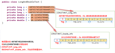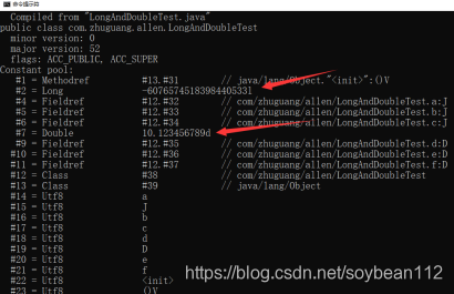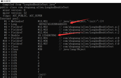 从结果上可以看到常量池第 #2 个常量池项(cp_info) 就是CONSTANT_Long_info,值为-6076574518398440533L;第 #7个常量池项(cp_info) 就是CONSTANT_Double_info,值为10.1234567890D。(常量池中其他的东西先别纠结啦,我们会面会一一讲解的哦)。