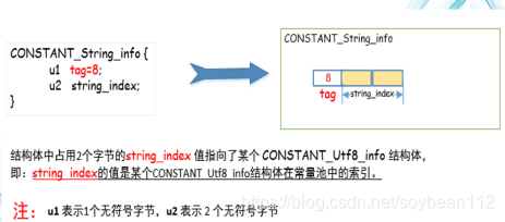 对于字符串而言,JVM会将字符串类型的字面量以UTF-8 编码格式存储到在class字节码文件中。这么说可能有点摸不着北,我们先从直观的Java源码中中出现的用双引号"" 括起来的字符串来看,在编译器编译的时候,都会将这些字符串转换成CONSTANT_String_info结构体,然后放置于常量池中。其结构如下所示: