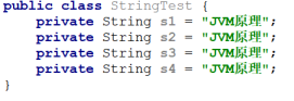 新建一个简单的StringTest.java测试类,然后在这个类里加一个"JVM原理" 字符串,然后,我们来看看它在class文件中是怎样组织的。代码如下图所示: