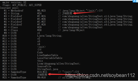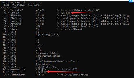 将Java源码编译成StringTest.class文件后,在此文件的目录下执行 javap -v StringTest 命令,会看到如下的常量池信息的轮廓: