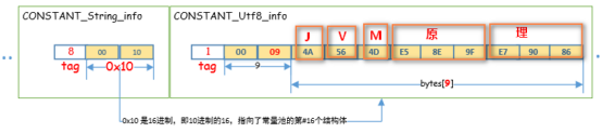 在上面的图中,我们可以看到CONSTANT_String_info结构体位于常量池的第#2个索引位置。而存放"Java虚拟机原理" 字符串的 UTF-8编码格式的字节数组被放到CONSTANT_Utf8_info结构体中,该结构体位于常量池的第#24个索引位置。
