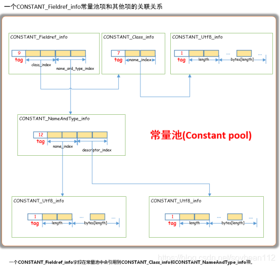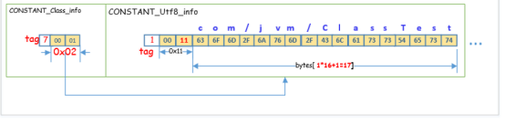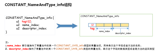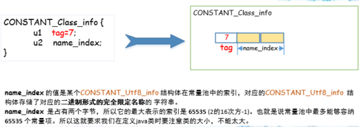 JVM会将某个Java 类中所有使用到了的类的完全限定名 以二进制形式的完全限定名 封装成CONSTANT_Class_info结构体中,然后将其放置到常量池里。CONSTANT_Class_info 的tag值为 7 。其结构如下:
