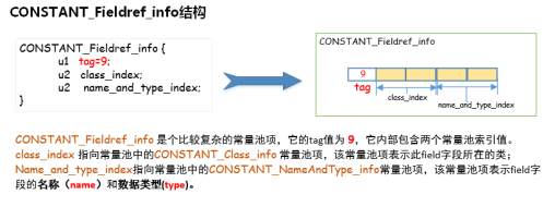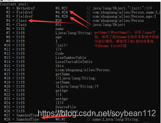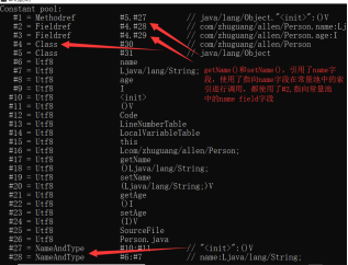 上面的Person类,使用javap -v Person指令,查看class文件的信息,你会看到,在Person类中引用到age和namefield字段的地方,都是指向了常量池中age和namefield字段对应的常量池项中。表示field字段的常量池项叫做CONSTANT_Fieldref_info。