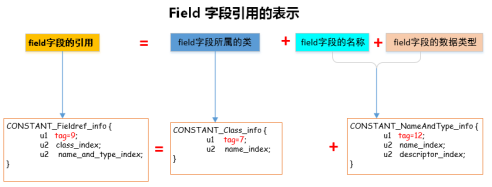 将它name和age封装成 CONSTANT_Fieldref_info 常量池项,放到常量池中,在类中引用到它的地方,直接放置一个指向field字段所在常量池的索引。