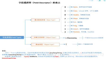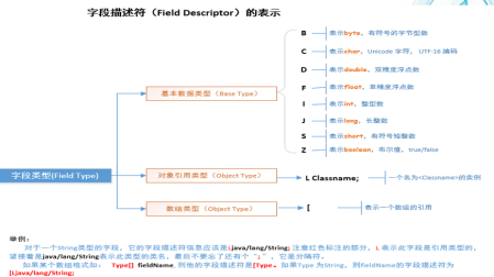 执行的结果中namefield字段的数据类型,它在#7个常量池项,以UTF-8编码格式的字符串“Ljava/lang/String;” 表示,这表示着这个field 字段是java.lang.String 类型的。关于field字段的数据类型,class文件中存储的方式和我们在源码中声明的有些不一样。请看下图的对应关系: