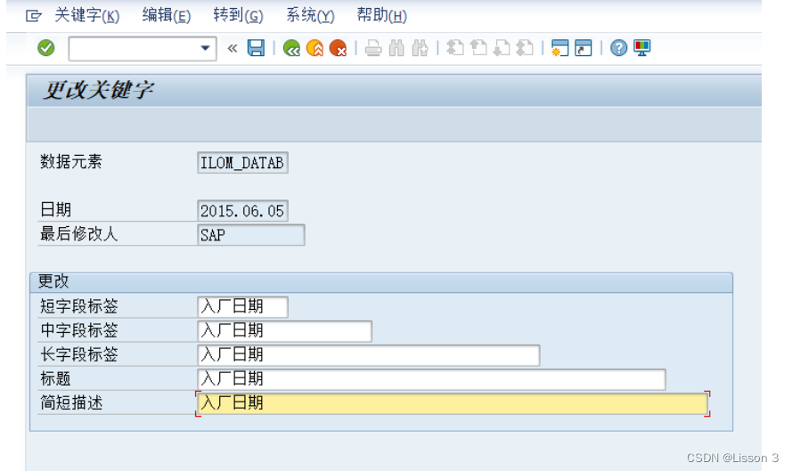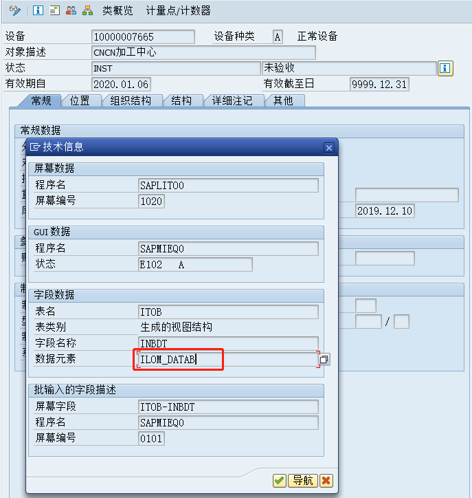 在前台显示界面,光标的定位在该字段上,点击F1,再点击技术信息,进入画面后,复制数据元素。(例如:将设备台帐中的开始日期改为入厂日期。)
