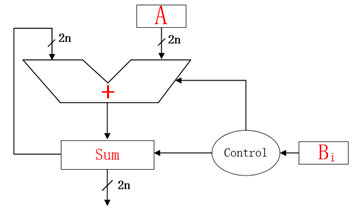 该串行结构乘法器使用一个加法器,由控制逻辑和输入数寄存器A,B组成,此种结构多种多样,基本原理均在于移位加。一个16位乘法器,n=16,乘累加次数为16,由Sum作为中间数暂存,Bi作为控制A是否被加入到Sum中,且每次A向左移位1比特,A*B输出比特位宽32。